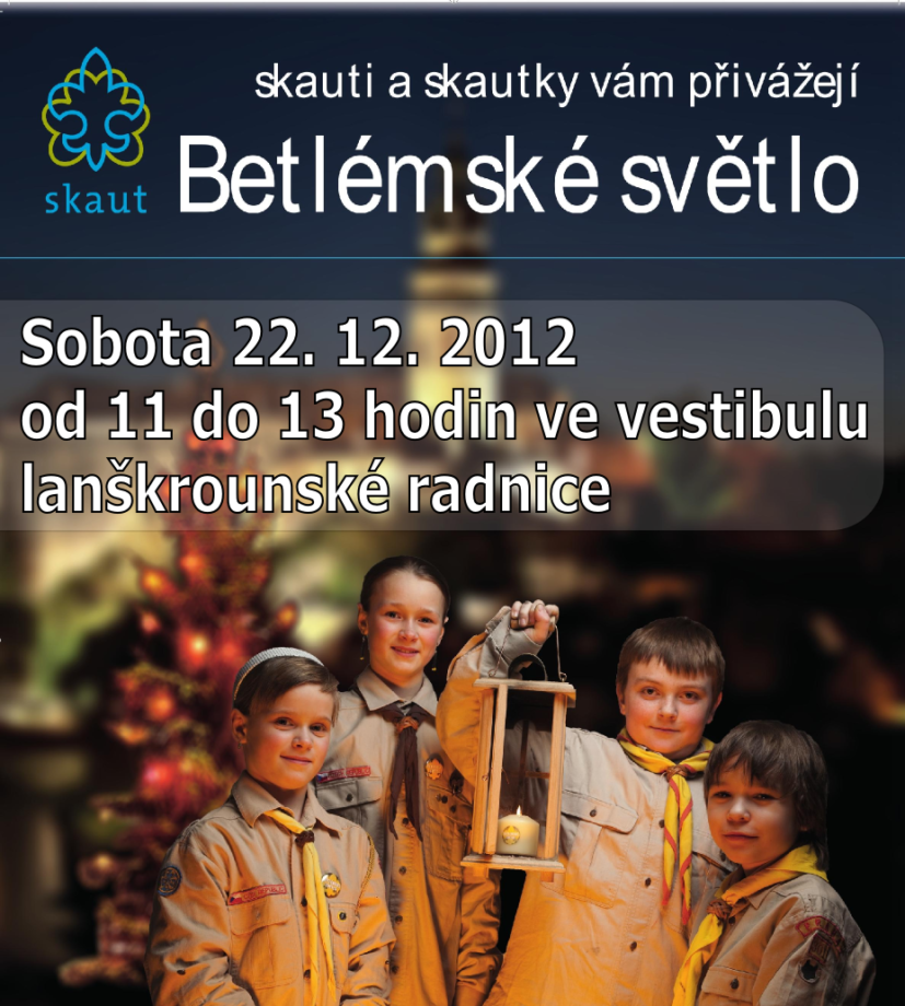 Jako každý rok přivezou skauti i letos do Česka vánoční plamínek Betlémského světla. Světýlko je zažehnuto v Betlémě, odkud se přesouvá do Vídně, a posléze je rakouskými skauty předáno skautským delegacím z celé Evropy… V České republice putuje nejprve do Brna, odkud je rozvezou vlaky po republice. V Lanškrouně si pro Betlémské světlo budete moci přijít v sobotu 22.12.2012 v době od 11:00 do 13:00 hodin na lanškrounskou radnici.