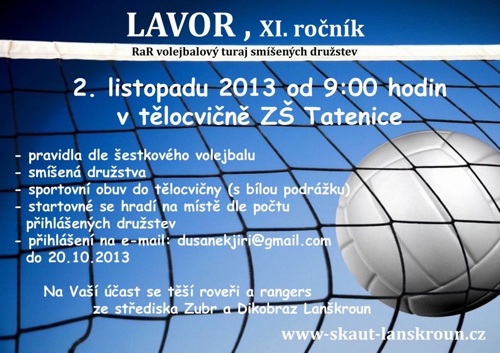 V sobotu 2. listopadu 2013 se od 9:00 hodin v tělocvičně Základní školy Tatenice uskuteční tradiční roverský volejbalový turnaj LAVOR.