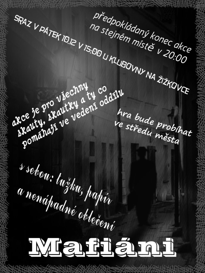 Po roce naše městečko obsadí Mafiáni z dolního a horního města. Sraz mafiánů v 15:00 hodin v chlapecké klubovně na ulici Žižkova. Akce je určena pro všechny skauty, skautky, rovery, rangers a vedoucí. Čím více nás bude, tím lépe.
