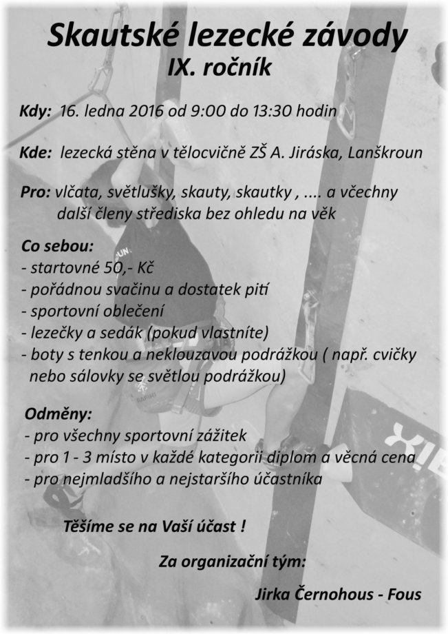 V sobotu 16. ledna 2016 od 09:00 do 14:00 hodin na lezecké stěně v tělocvičně ZŠ A. Jiráska v Lanškrouně se uskuteční již IX. ročník lezeckých závodů.