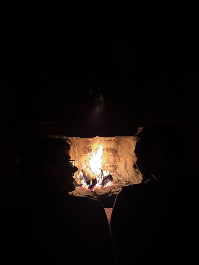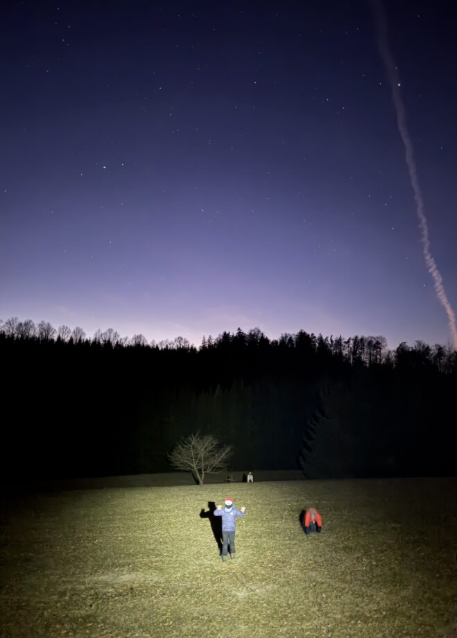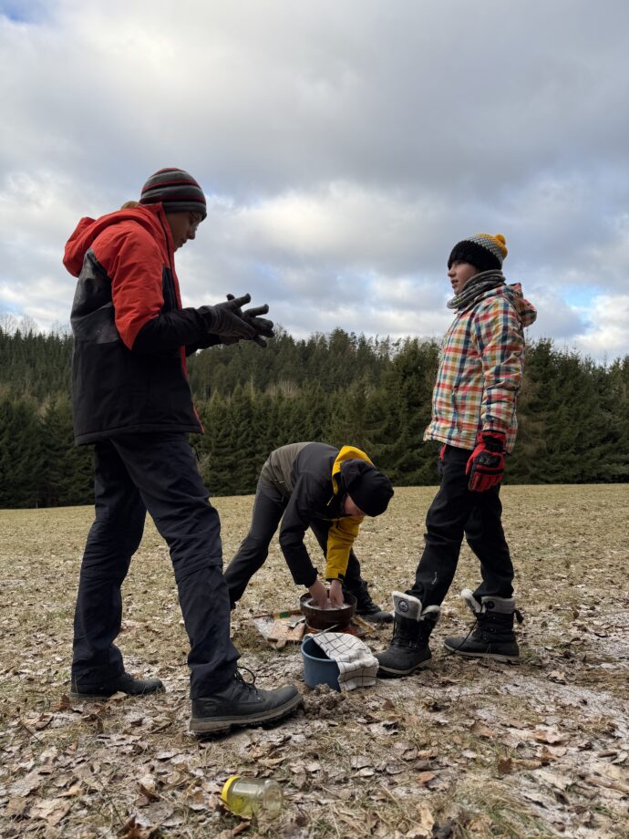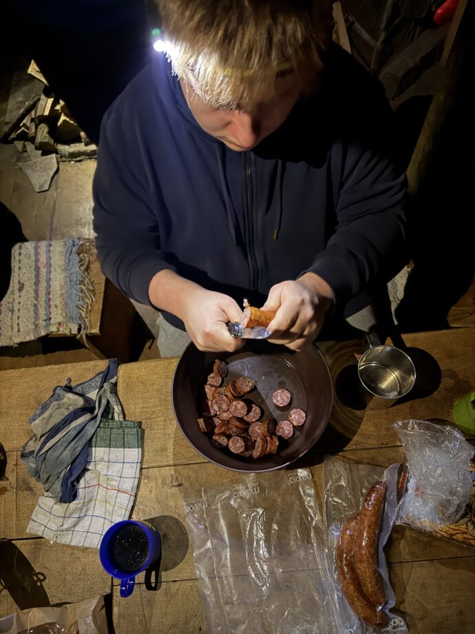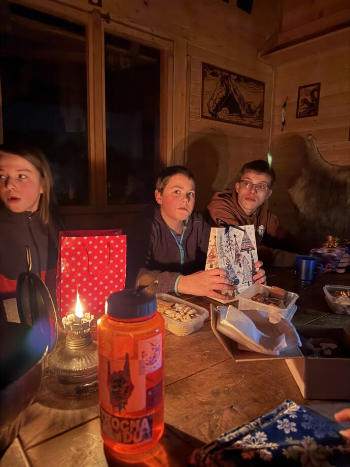 Tam už jsme si v tradičním duchu rozdělili úkoly – úklidit, donést úžitkovou vodu, umýt nádobí, vybalit se, připravit dřevo a další nezbytnosti. Naší motivací byly touha po teplé masité večeři, chtíč se zahřát a ideálně vše stihnout do setmění. Přijela také návštěva, Kuba s Turbánkem. Večer jsme si předali drobné dárky, ochutnali cukroví a zahráli si majáky.