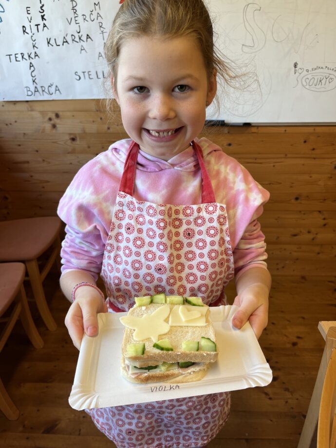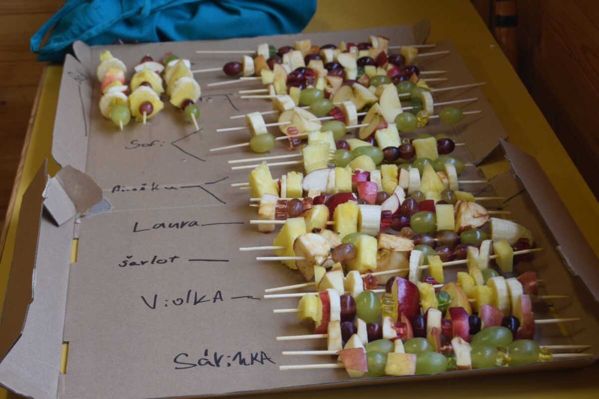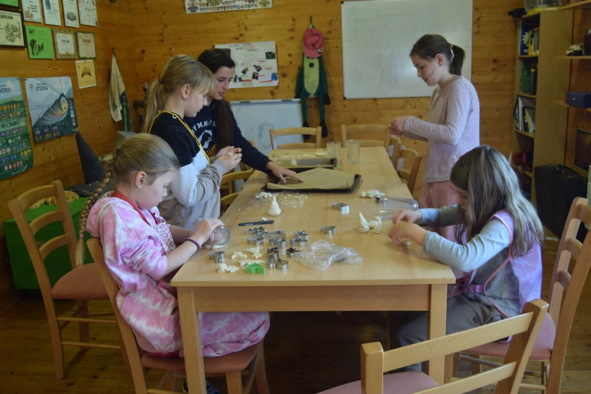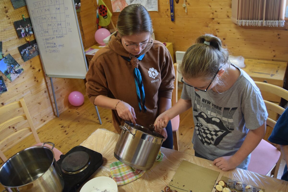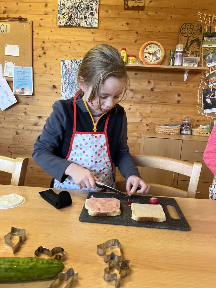 Na prvním stanovišti si světlušky připravovaly vlastní pizzu, od rozválení těsta až po zdobení oblíbenými surovinami. Následovaly ovocné špízy, kde si holky na špíz zdobily nejen ovoce, ale i sladké bonbónky. Třetí zastávkou byly chlebíčky, které si světlušky mohly vylepšit pomocí vykrajovátek a následně ozdobit zeleninou, sýrem a šunkou. Dalším stanovištěm byly banány v čokoládě, které měly velký úspěch. Poslední stanoviště patřilo tvoření z jedlé hmoty, kde si holky mohly vyrobit výrobky dle vlastní fantazie. Během dopoledne nechyběly ani hry a soutěže, při kterých si holky odpočinuly od pečení a tvoření. Na závěr jsme uspořádaly malou výstavu, kde jsme si mohly prohlédnout výtvory ostatních.