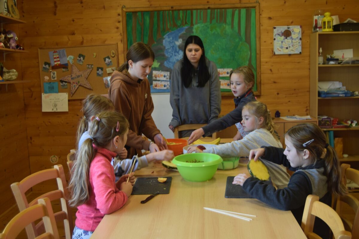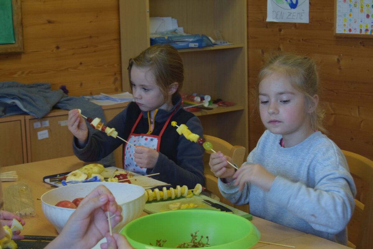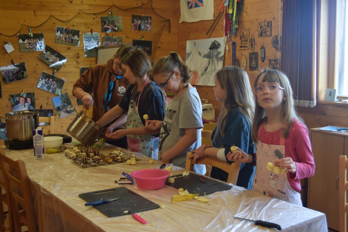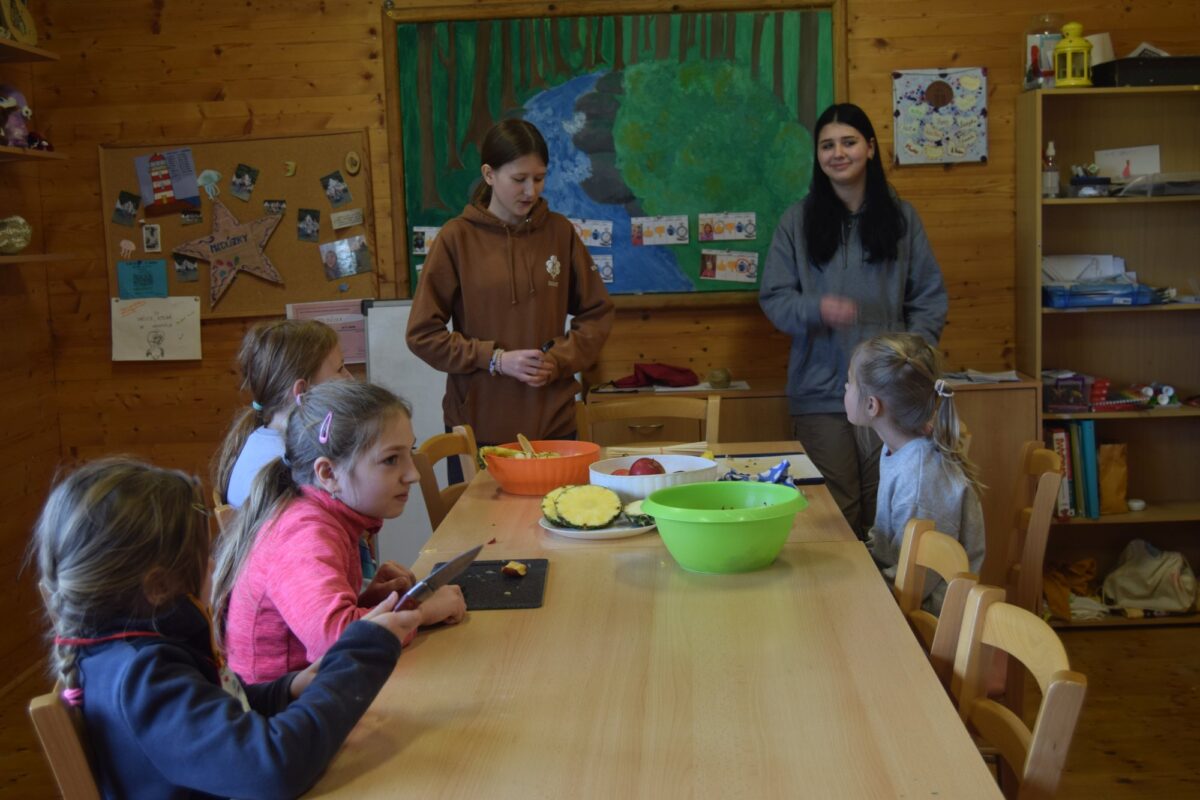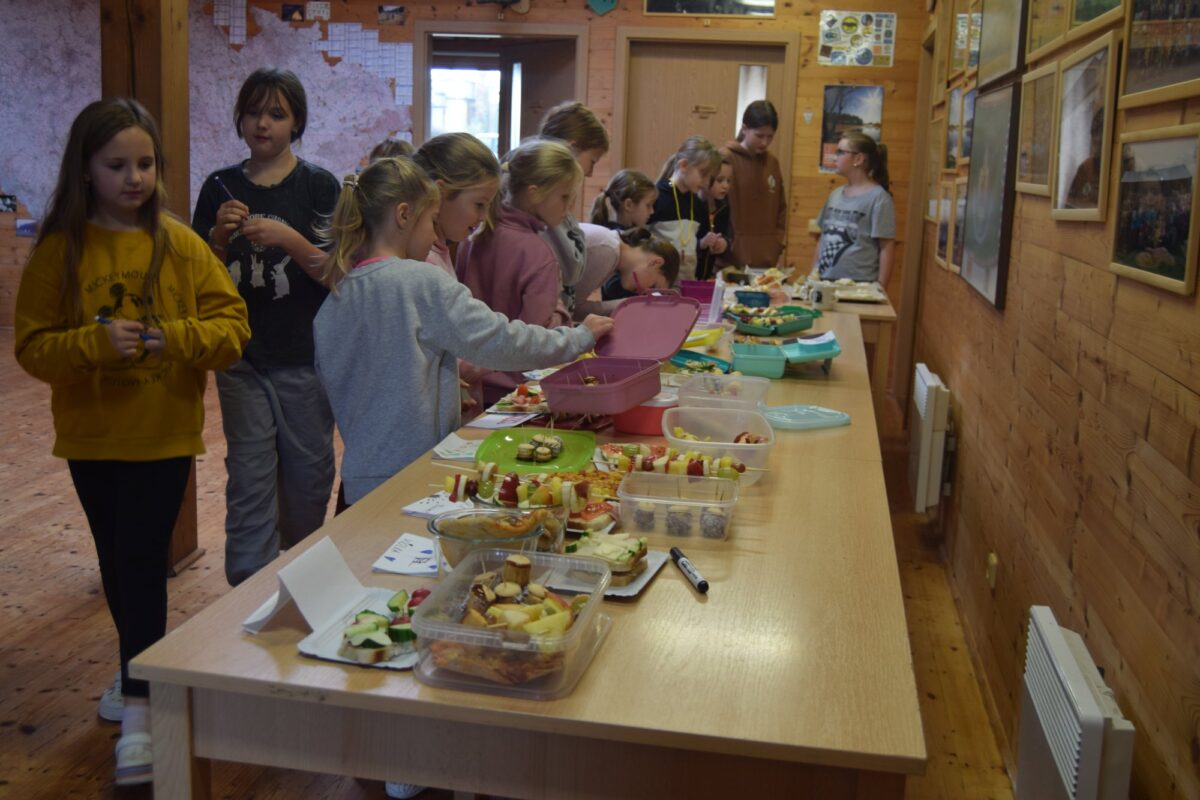 Na prvním stanovišti si světlušky připravovaly vlastní pizzu, od rozválení těsta až po zdobení oblíbenými surovinami. Následovaly ovocné špízy, kde si holky na špíz zdobily nejen ovoce, ale i sladké bonbónky. Třetí zastávkou byly chlebíčky, které si světlušky mohly vylepšit pomocí vykrajovátek a následně ozdobit zeleninou, sýrem a šunkou. Dalším stanovištěm byly banány v čokoládě, které měly velký úspěch. Poslední stanoviště patřilo tvoření z jedlé hmoty, kde si holky mohly vyrobit výrobky dle vlastní fantazie. Během dopoledne nechyběly ani hry a soutěže, při kterých si holky odpočinuly od pečení a tvoření. Na závěr jsme uspořádaly malou výstavu, kde jsme si mohly prohlédnout výtvory ostatních.