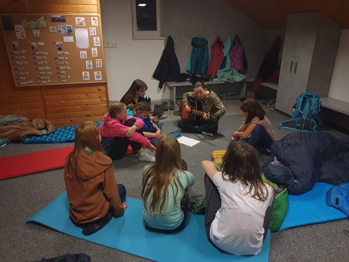 Došli jsme do krásné, ale malé klubovny, kde se Pepin a Zoubek vydaly nakoupit. My jsme zatím hráli karty a různé hry a dali si večeři. Nakonec jsme sepisovali skautské denní hlášení. Dole měli poradu a řešili, že prý moc dupeme. Potom se Pepina a Zoubek vrátily a šlo se spát.