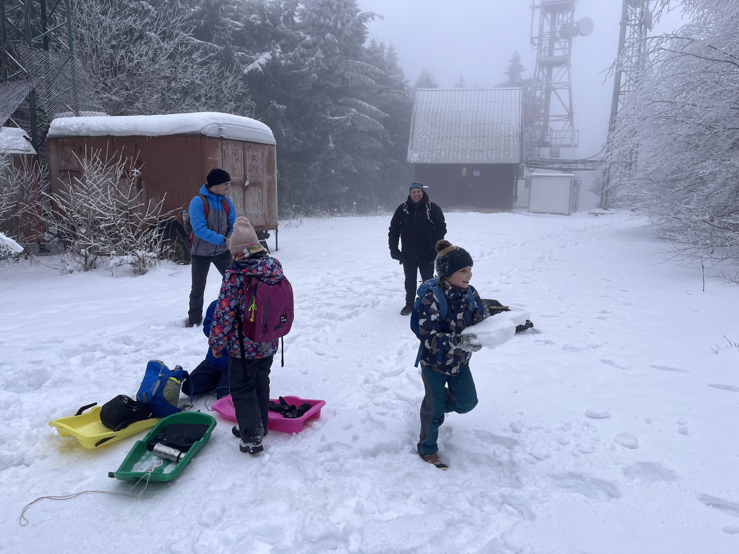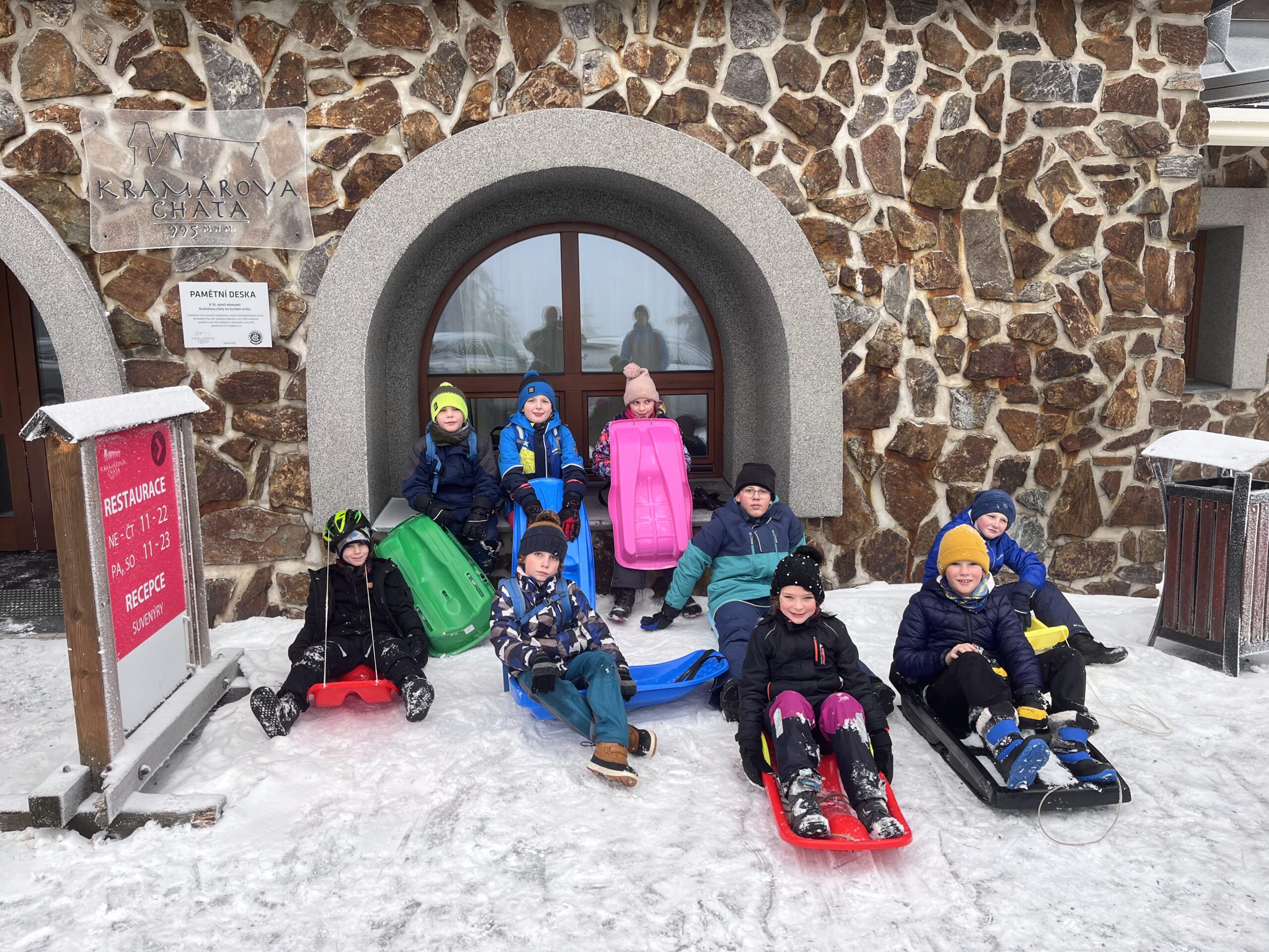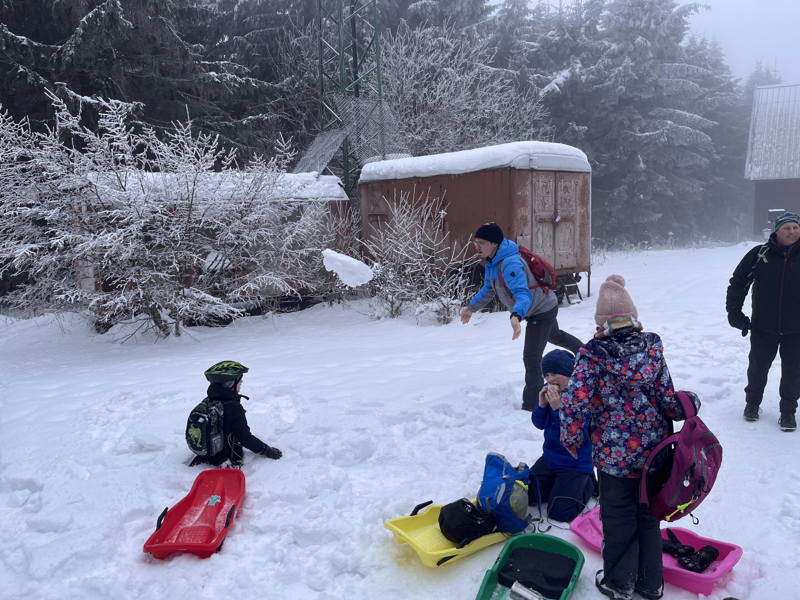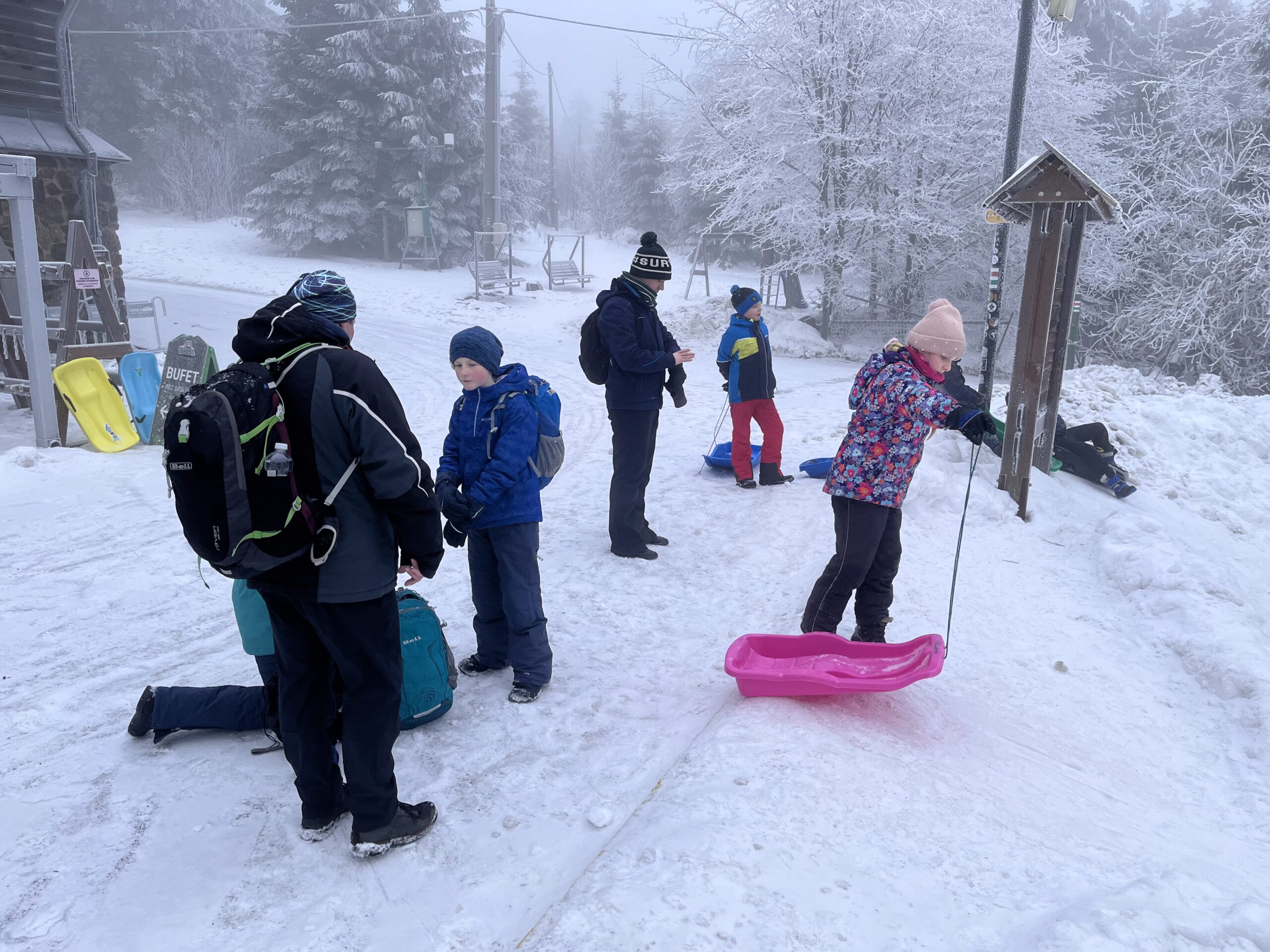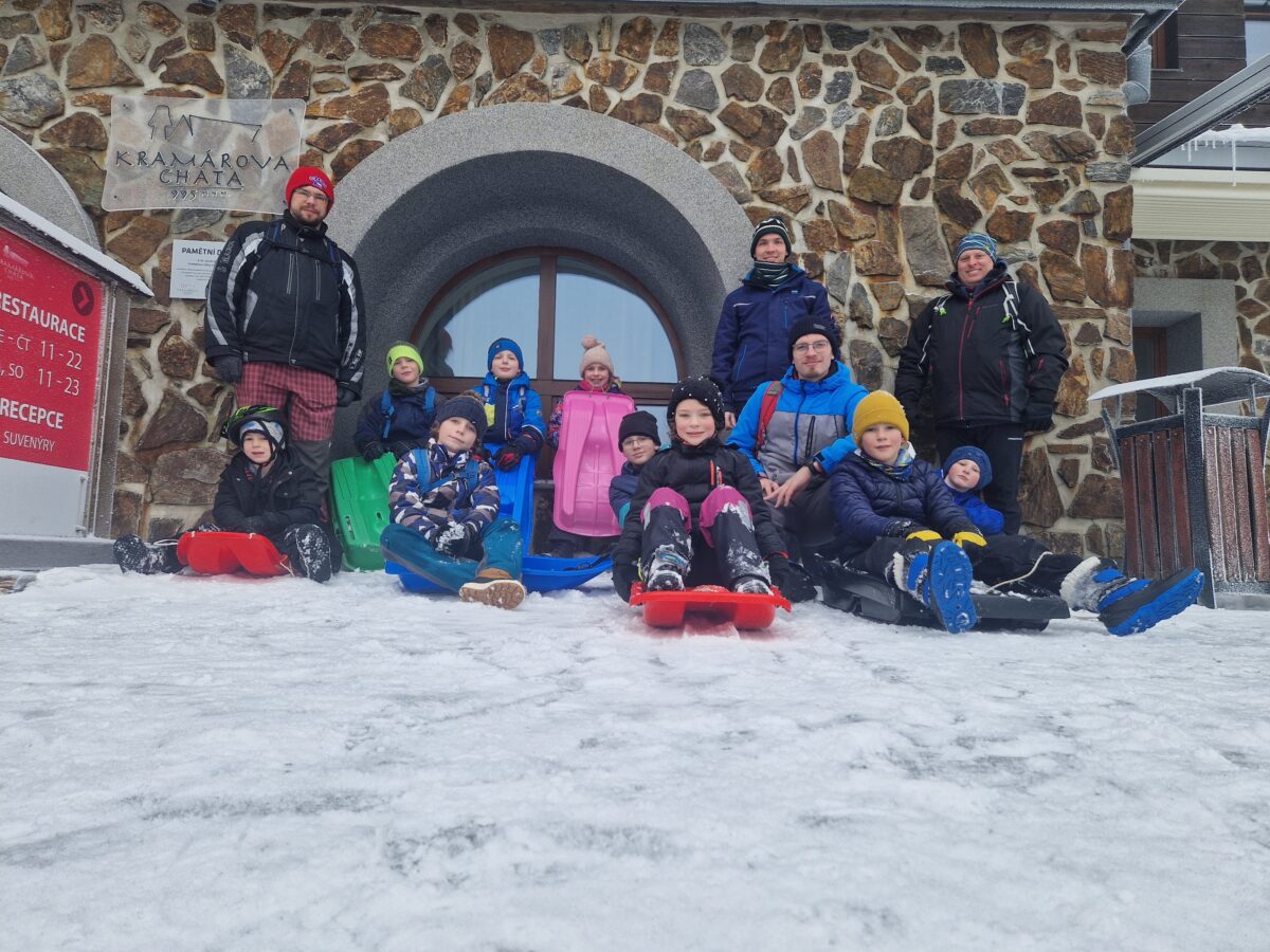 V sobotu 24. ledna 2026 jsme vyrazili na naši zimní výpravu. Obloha sice nebyla přímo azurová, sněhu ale bylo dost, takže jsme s sebou vzali i boby a vyjeli jsme auty od klubovny směre Suchý vrch. Zaparkovali jsme na Červenovodském sedle a zahájili výstup na vrchol. Po cestě jsme si užili dostatek sjezdů a výjezdů, alespoň první část cesty velmi přála bobování. Na Hvězdě proběhlo první občerstvení. Další výšlap byl poněkud obtížnější, protože cesta dále byla více kamenitá a také o dost strmější. Došli jsme ale všichni v pořádku až na vrchol a ke Kramářově chatě. U chaty byl také hezký kopeček, dalo se tedy krásně bobovat i zde. Nakonec jsme se šli všichni občerstvit do místního bufetu, udělali vrcholovou fotku a zahájili jsme sestup dolů. Cesta dolů ke Hvězdě se ukázala jako dost obtížná, protože se nedalo pořádně sjíždět kvůli kamenům a nerovnosti na cestě. Ale od Hvězdy dolů byla cesta krásně široká a plná sněhu, takže konec výpravy byla jedna velká bobovací zábava (nevěřili byste, jak rychle se dá vyběhnout od sedla až ke Hvězdě). Když jsme se dost vyjezdili, nasedli jsme opět do aut a dorazili šťastně až domů.