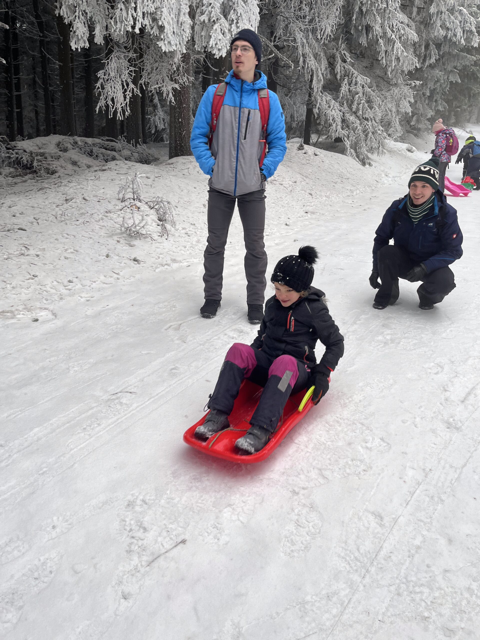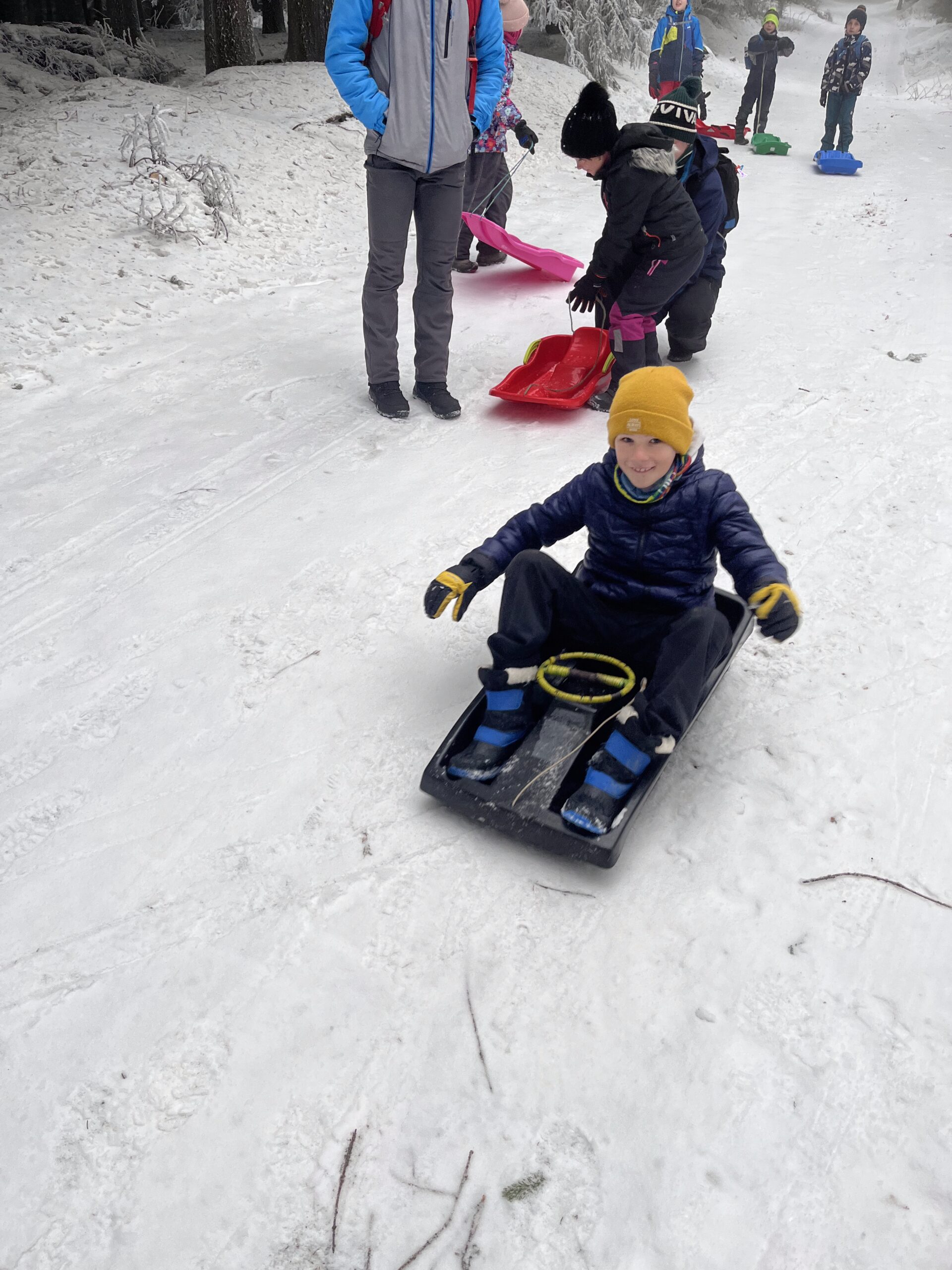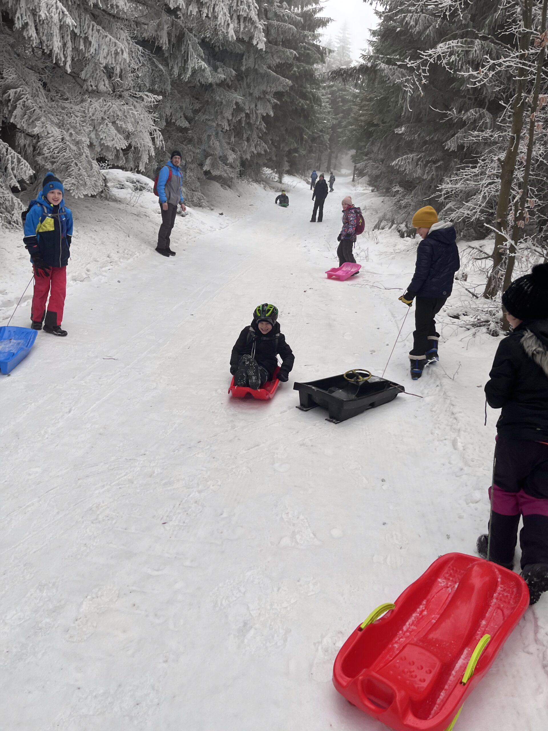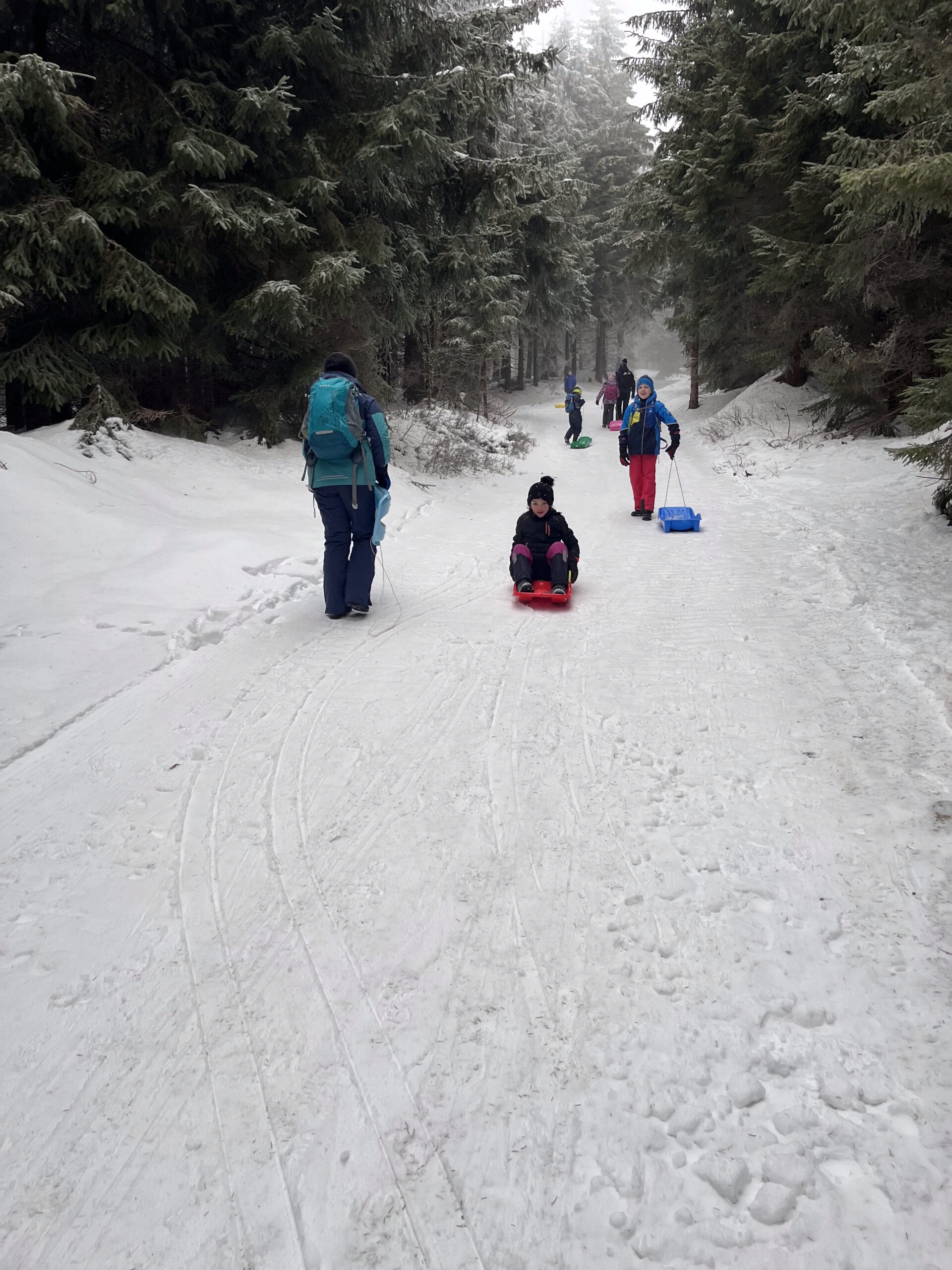 V sobotu 24. ledna 2026 jsme vyrazili na naši zimní výpravu. Obloha sice nebyla přímo azurová, sněhu ale bylo dost, takže jsme s sebou vzali i boby a vyjeli jsme auty od klubovny směre Suchý vrch. Zaparkovali jsme na Červenovodském sedle a zahájili výstup na vrchol. Po cestě jsme si užili dostatek sjezdů a výjezdů, alespoň první část cesty velmi přála bobování. Na Hvězdě proběhlo první občerstvení. Další výšlap byl poněkud obtížnější, protože cesta dále byla více kamenitá a také o dost strmější. Došli jsme ale všichni v pořádku až na vrchol a ke Kramářově chatě. U chaty byl také hezký kopeček, dalo se tedy krásně bobovat i zde. Nakonec jsme se šli všichni občerstvit do místního bufetu, udělali vrcholovou fotku a zahájili jsme sestup dolů. Cesta dolů ke Hvězdě se ukázala jako dost obtížná, protože se nedalo pořádně sjíždět kvůli kamenům a nerovnosti na cestě. Ale od Hvězdy dolů byla cesta krásně široká a plná sněhu, takže konec výpravy byla jedna velká bobovací zábava (nevěřili byste, jak rychle se dá vyběhnout od sedla až ke Hvězdě). Když jsme se dost vyjezdili, nasedli jsme opět do aut a dorazili šťastně až domů.