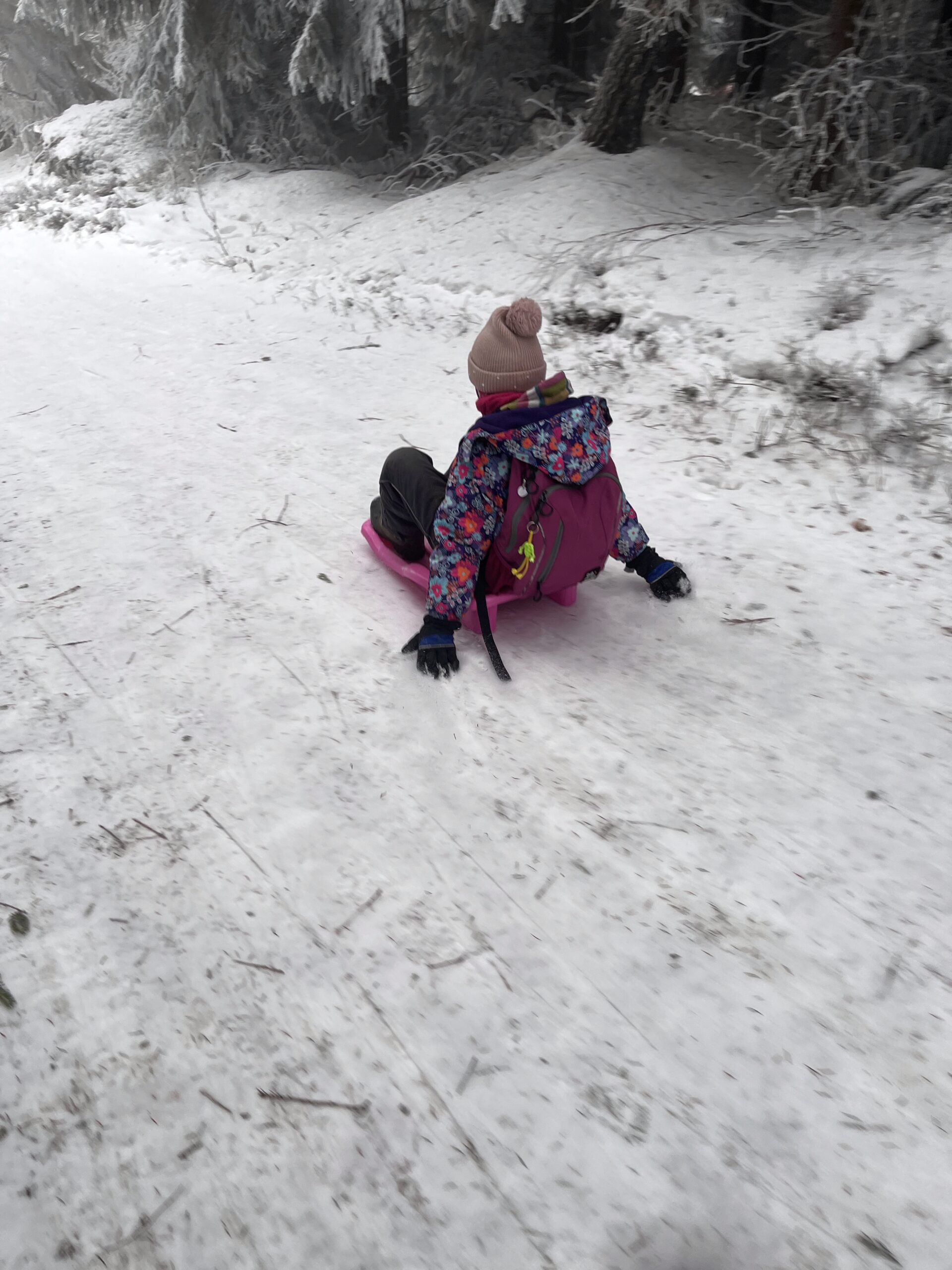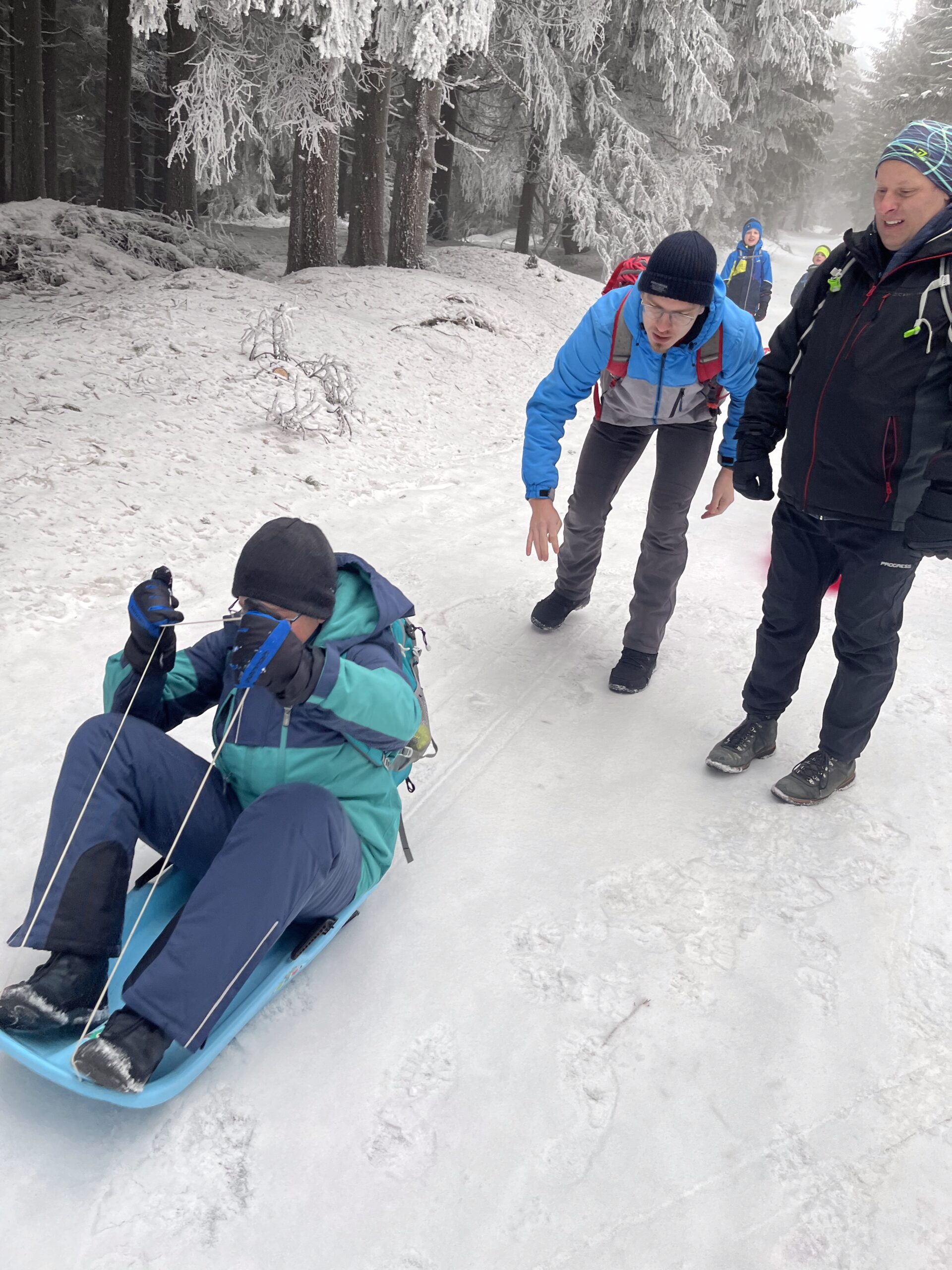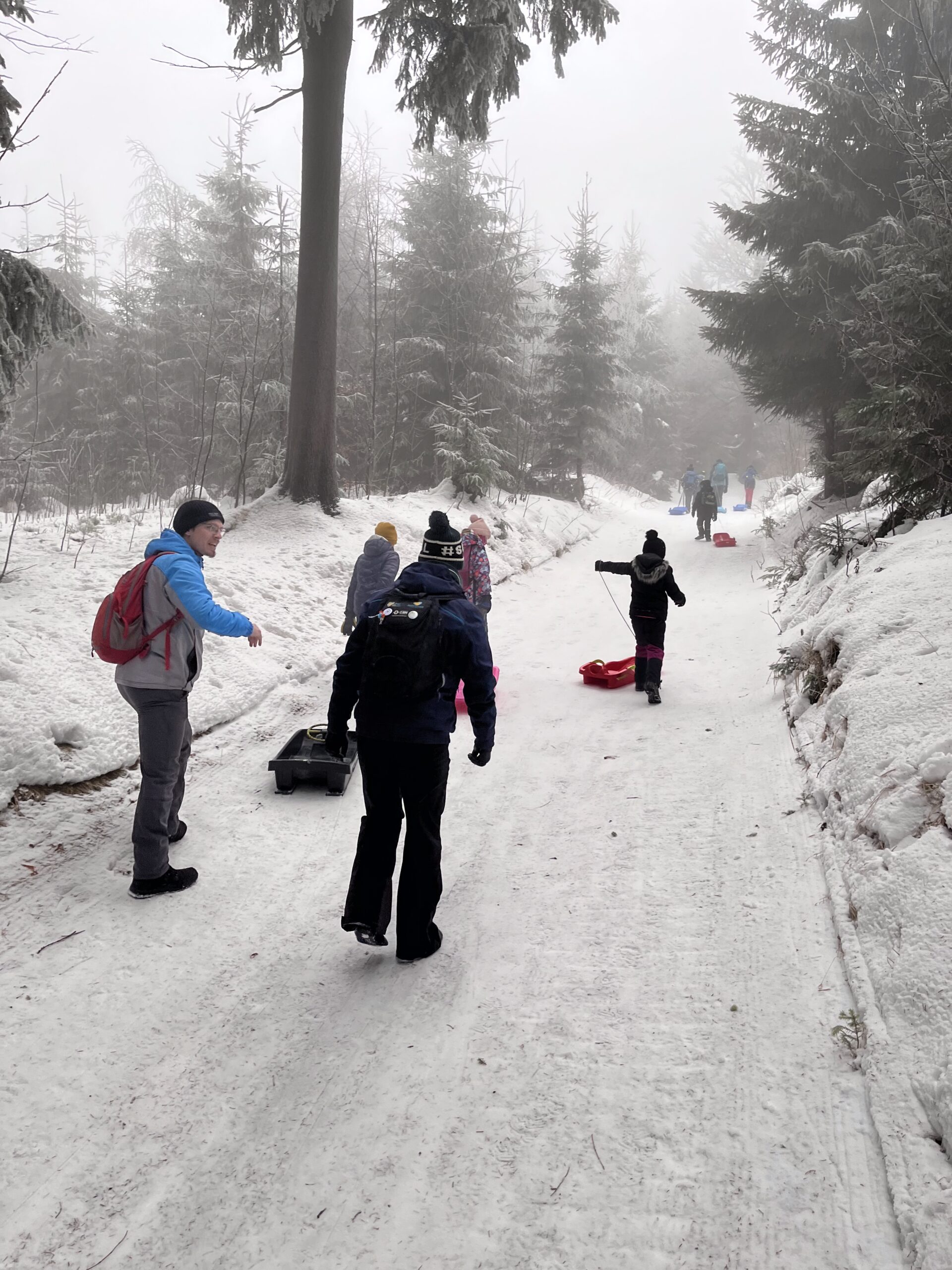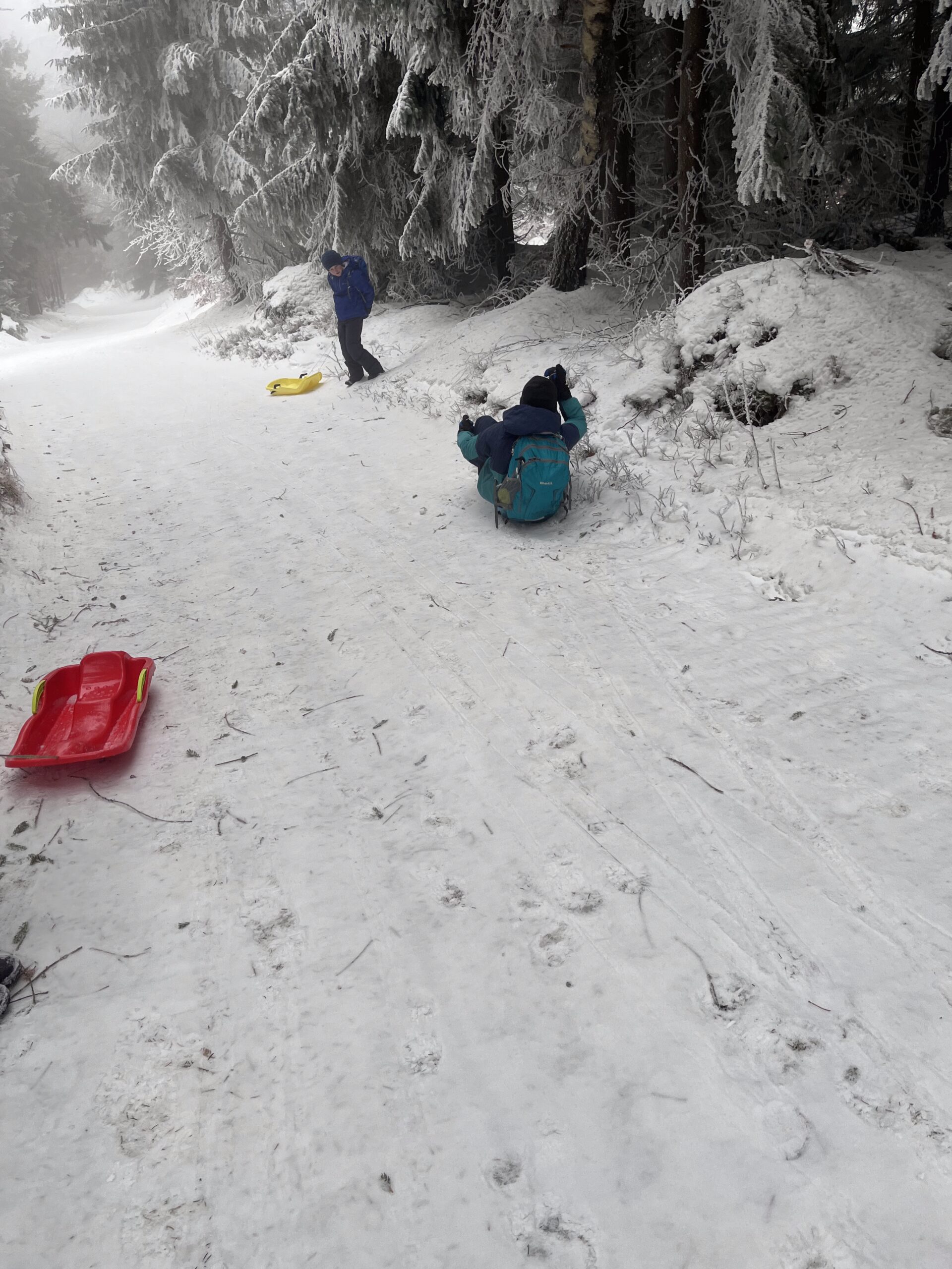 V sobotu 24. ledna 2026 jsme vyrazili na naši zimní výpravu. Obloha sice nebyla přímo azurová, sněhu ale bylo dost, takže jsme s sebou vzali i boby a vyjeli jsme auty od klubovny směre Suchý vrch. Zaparkovali jsme na Červenovodském sedle a zahájili výstup na vrchol. Po cestě jsme si užili dostatek sjezdů a výjezdů, alespoň první část cesty velmi přála bobování. Na Hvězdě proběhlo první občerstvení. Další výšlap byl poněkud obtížnější, protože cesta dále byla více kamenitá a také o dost strmější. Došli jsme ale všichni v pořádku až na vrchol a ke Kramářově chatě. U chaty byl také hezký kopeček, dalo se tedy krásně bobovat i zde. Nakonec jsme se šli všichni občerstvit do místního bufetu, udělali vrcholovou fotku a zahájili jsme sestup dolů. Cesta dolů ke Hvězdě se ukázala jako dost obtížná, protože se nedalo pořádně sjíždět kvůli kamenům a nerovnosti na cestě. Ale od Hvězdy dolů byla cesta krásně široká a plná sněhu, takže konec výpravy byla jedna velká bobovací zábava (nevěřili byste, jak rychle se dá vyběhnout od sedla až ke Hvězdě). Když jsme se dost vyjezdili, nasedli jsme opět do aut a dorazili šťastně až domů.