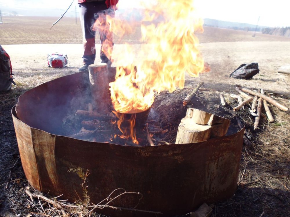 Došli jsme k prvnímu zastavení křížové cesty. Každý dostal papírek na němž bylo napsáno něco k onomu zastavení. Pokračovali jsme dále do kopce po křížové cestě. Došli jsme až na Andrlův chlum. Zde jsme si dali přestávku na odpočinek. Počasí bylo opravdu krásné :) Udělali jsme si společnou fotku. Zahráli jsme si zde krátkou hru a poté vyrazili dále. Šli jsme lesem, po lukách, mokřady, přes moře divočiny a při tomto dobrodružství jsme si stihli zahrát i pár her-nálety apod. Došli jsme na louku kde jsme objevili vhodné místo pro rozdělání ohně. Byl zde pěkný výhled. Rozdělali jsme oheň, a zapálili plynovej hořák. Zatímco Danovo družstvo se drželo tradic a koupilo polévku (plus nudle atd.), tak Matějovo družstvo koupilo hranolky+kečup a olej. Každé družstvo mělo vlastní kotlík. Dali jsme ohřát vodu nad plynovej hořák. Matěj nalil olej do kotlíku a vložil ho na oheň. Chvíle čekání. BLAF. Šílené pekelné plameny okolo ohně. Olej v kotlíku chytnul. Převrátili jsme kotlík klackem a čekali až plameny ustoupí. Kotlík se stal prozatím nepoužitelným. Plyn v hořáku došel. Dali jsme tedy vodu v kotlíku na oheň a čekali až začne vřít. Po mírných problémech jsme uvařili polévku. Byla chutná :)