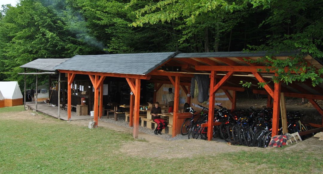 Po roce opět pokračovala táborová výstavba. K jídelně přibyl přístřešek na kola. Nejen lidé, ale i naše kola mohou mít důstojné podmínky :-). (A těch zastřešených 20 m2 třeba využijeme i jinak.)