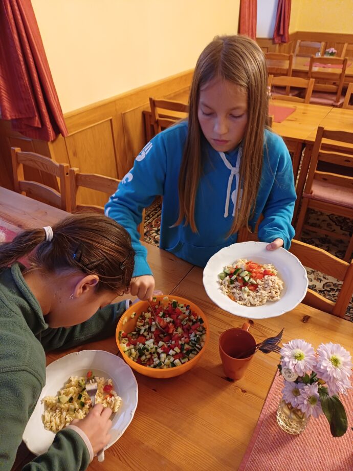 Druhý den ráno jsme si po snídani prohlédly zámek a pak jely autobusem do nedaleké Doubravice nad Svitavou. Tam jsme navštívily pštrosí farmu, ve které jsme kromě pštrosů viděly kozy, lamy a také nandu. Velké ptáky bylo možné nakrmit, tak jsme se několik balíčků s krmením rozhodly koupit a všechny jsme si to postupně vyzkoušely. Zpáteční cestu, která byla dlouhá asi 10 km, jsme šly pěšky. Během chůze jsme hrály různé hry, a protože jsme trasu zvládly moc rychle a zbyl nám čas, podívaly jsme se ještě na boskovický hrad. Po návratu na faru jsme si trochu odpočaly a poté jsme začaly společně chystat večeři. Večer byl ještě chvíli čas na hry a poté už jsme opět zalehly do spacáků.